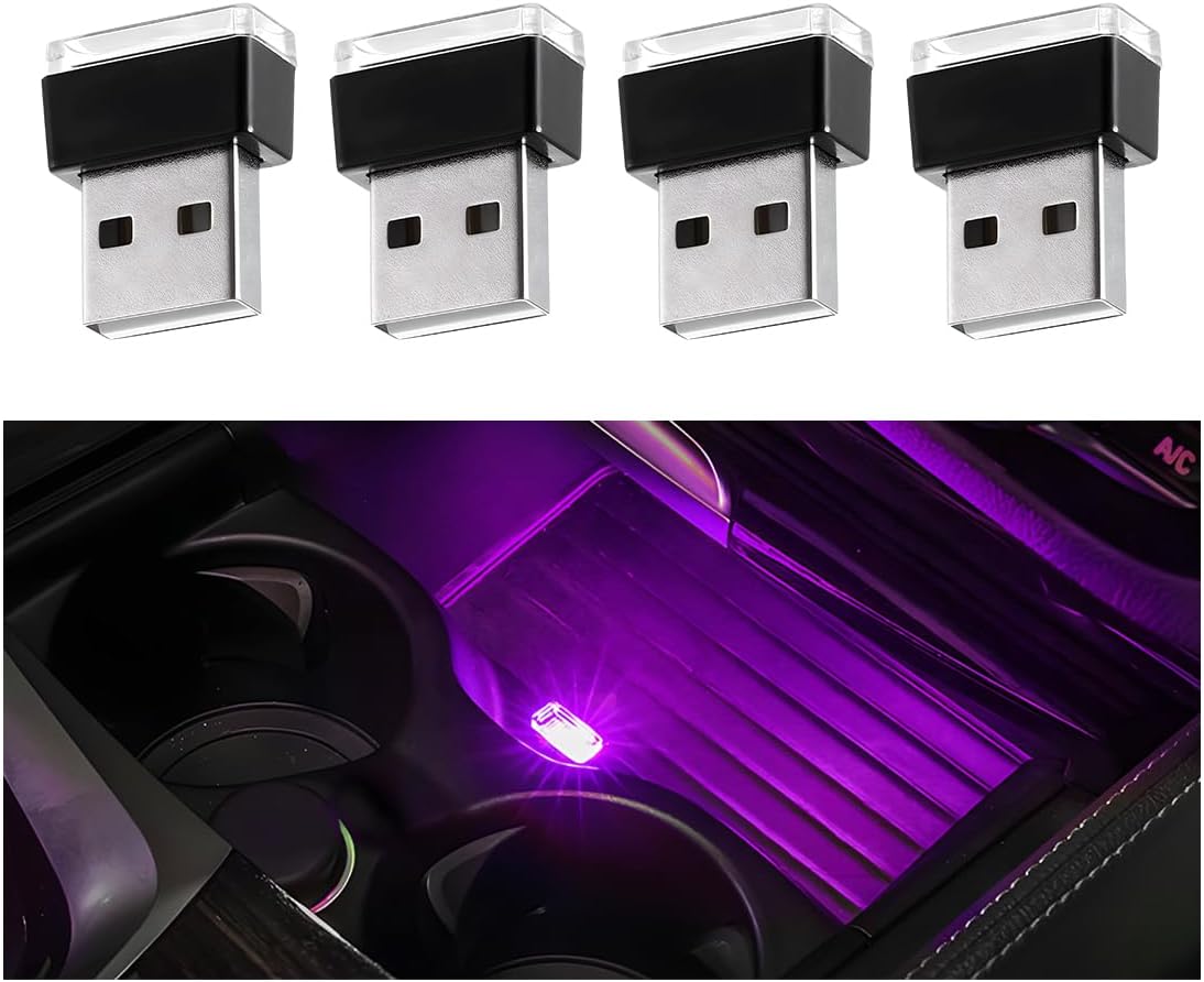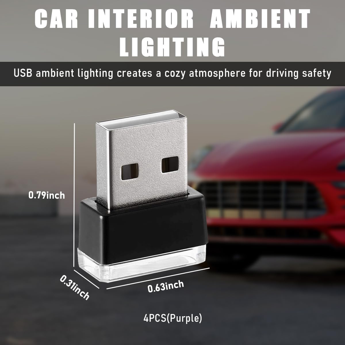 4 PCS USB LED Car Atmosphere Lights, Portable Mini Ambient Night Lamp with USB Interface, Plug-in USB LED Atmosphere Lighting Decor for Auto Home Office (Purple)