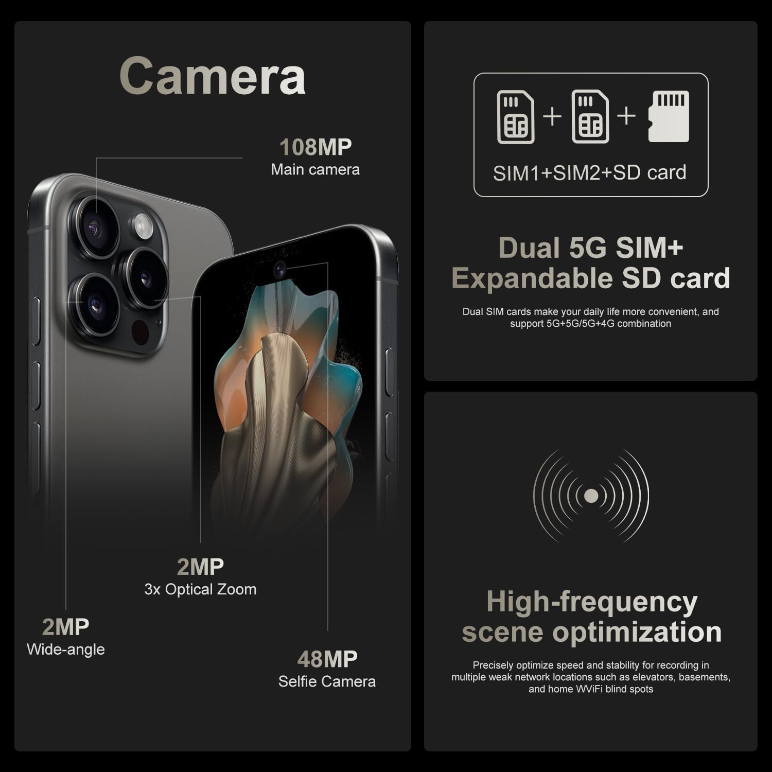 A15 Pro Max 5G Unlocked Cell Phone, 8GB +512GB Unlocked Phones, Android 14.0, 48MP+108MP Camera, 5G Dual SIM Smartphone, 120Hz, 6800 mAh Battey Android Phone, Unlocked for All Carriers(Black)