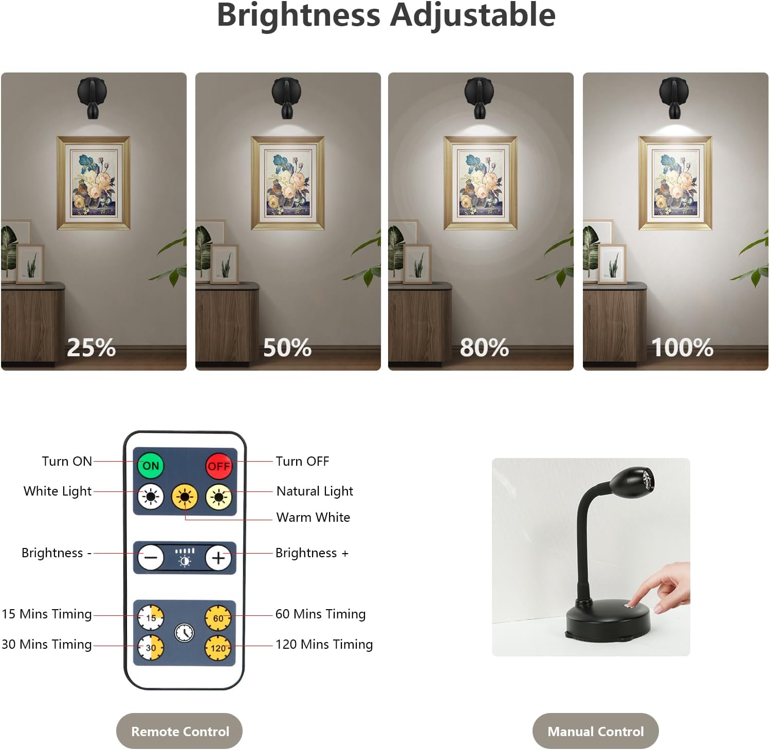 [Adjustable Brightness] – The small spotlight has a long lasting super bright LED, 80 Lumens, you can press 10%, 40%, 80% or 100% directly, or press the “+” or “-” button on the remote to adjust the brightness level as you wish.