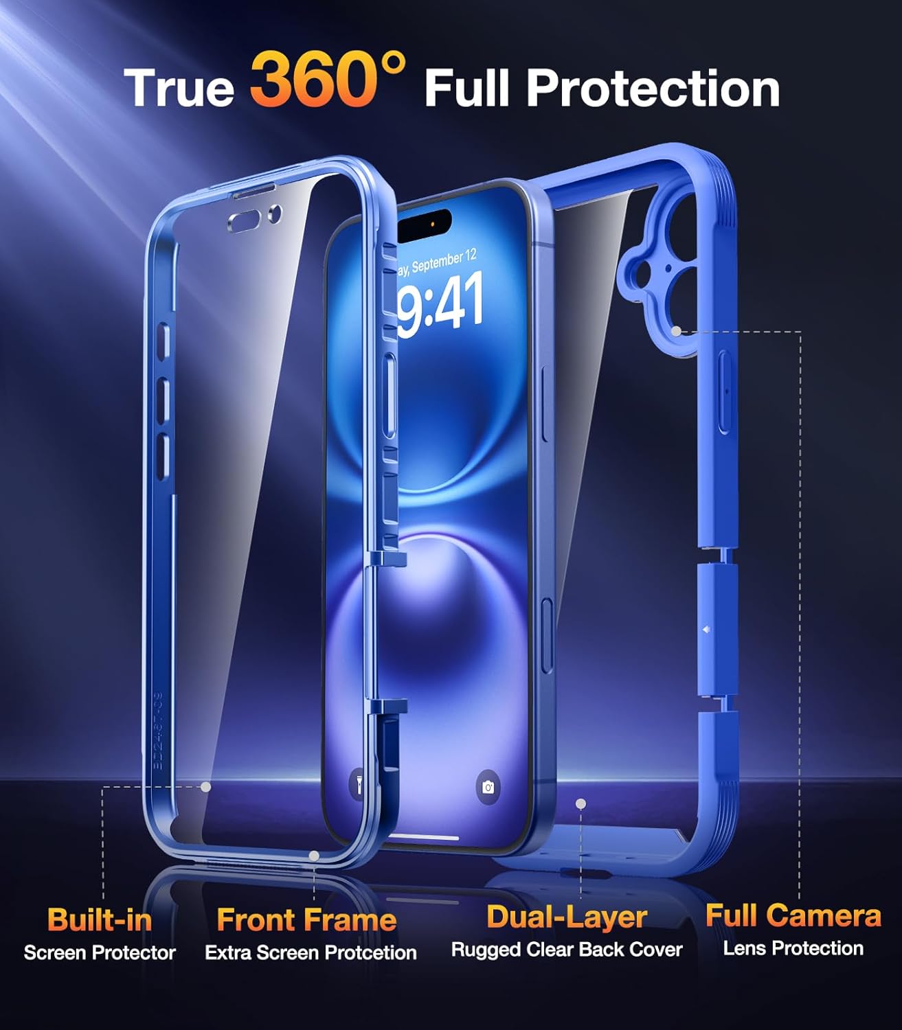 Diaclara Designed for iPhone 16 Case, Full Body Rugged Case with Built-in Touch Sensitive Anti-Scratch Screen Protector, Upgraded [Full Camera Protection] for iPhone 16 6.1″ (Ultramarine) Blue