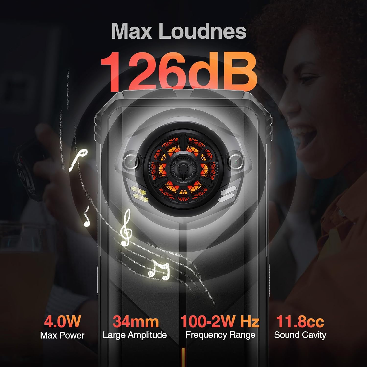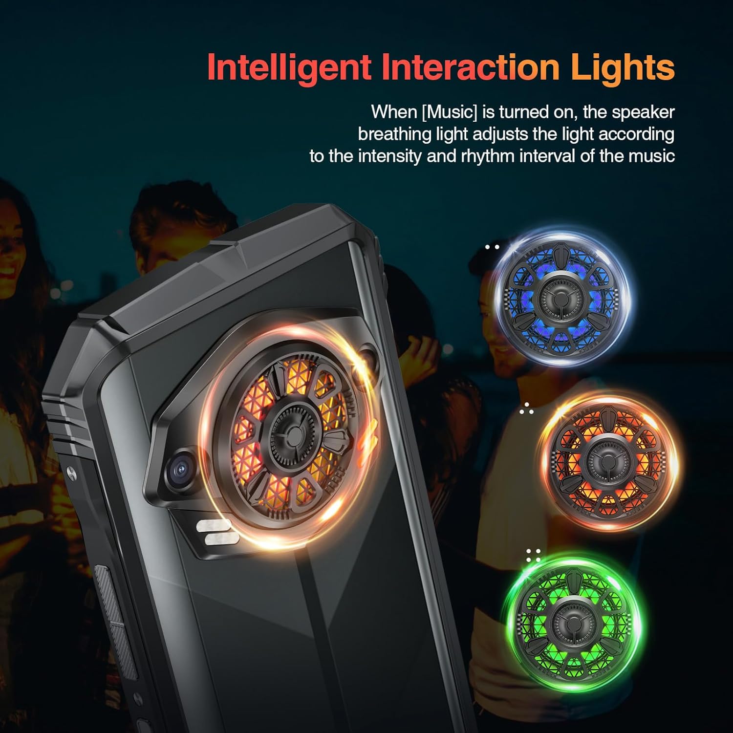 【Multi-Color Intelligent Interaction Lights & 4.0W Super Speaker】DOOGEE S punk phone unlocked is equipped with colorful light effects that can be customized to suit different scenarios such as incoming calls, music playback, SMS notifications, and charging, adding a stylish flair to your experience. The DOOGEE S Punk smartphone features 34mm large-amplitude speakers with 3W high power and a substantial 11.8cc sound cavity. Combined with its powerful 4W super speaker and 126 dB volume, you’ll experience crystal-clear, immersive sound in any setting—be it noisy construction sites, bustling outdoor events, or vibrant music parties.
