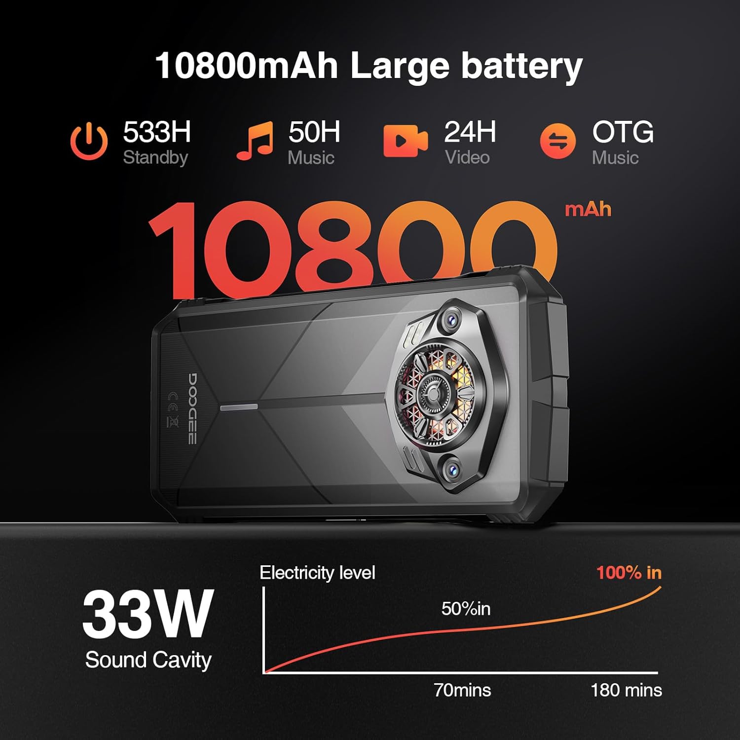 【10800mAh Ultra Long-Life Battery & 33W Fast Charging】Meet the DOOGEE S Punk rugged smartphone, featuring a powerful 10800mAh battery for up to 533 hours of standby/25 hours of talk time/50 hours of music playback/24 hours of video streaming. With 33W fast charging, you’ll spend less time hooked up to an outlet and more on the go. Plus, this rugged smartphone doubles as a power bank to charge other devices via OTG cables (not included). Say goodbye to battery anxiety and embrace all-day power and versatility.