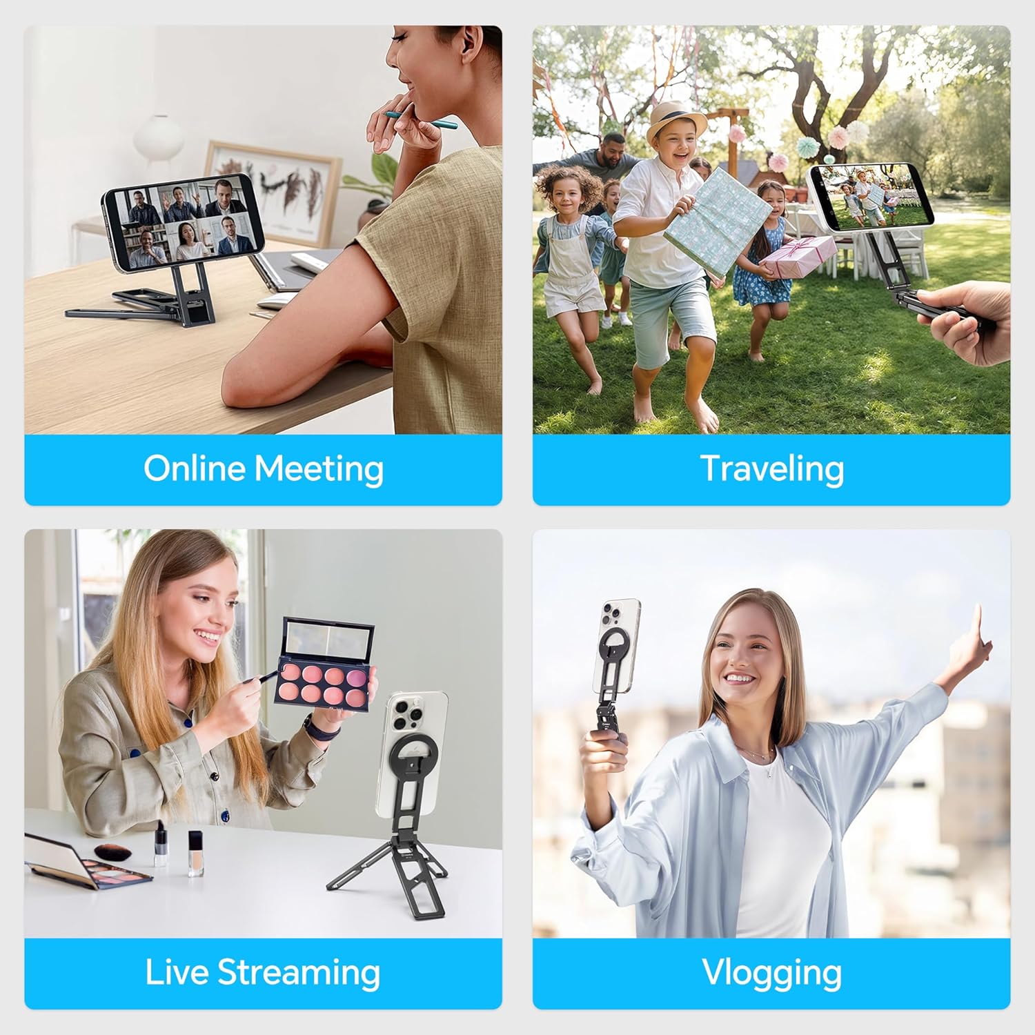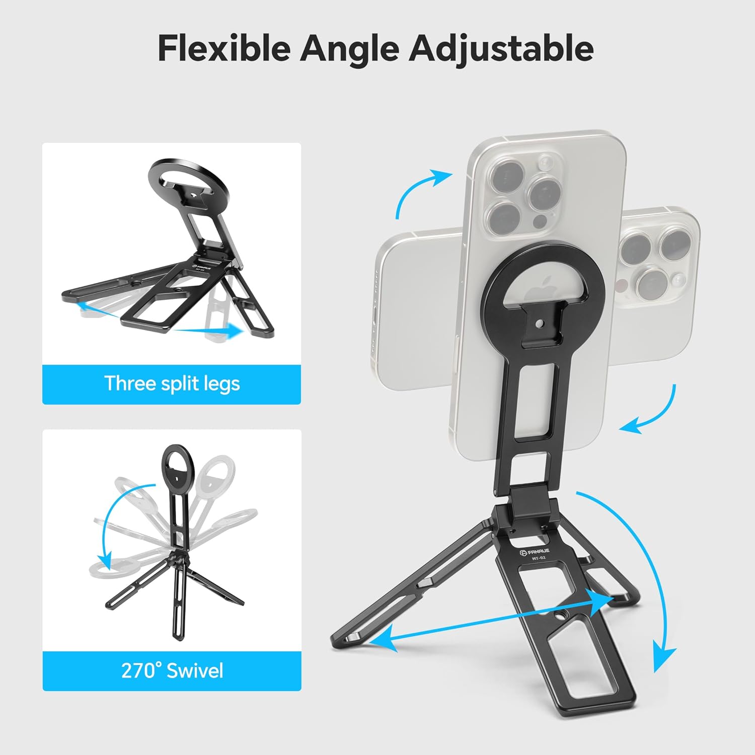 Strong Magnets: The magnetic phone tripod is made of premium aluminium alloy and is precision CNC machined. Pocket cell phone stand with strong magnetic, ensures a secure connection between your phone and the stand, and paired with non slip rubber pad prevents accidental falling off.