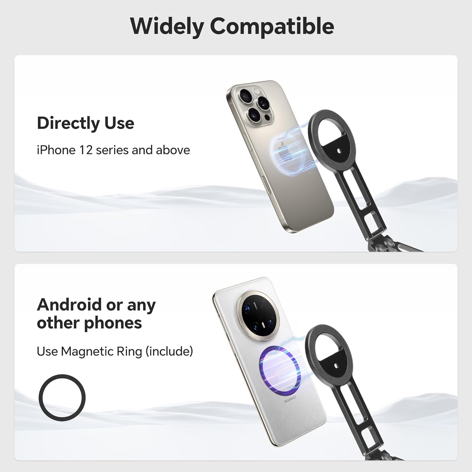 Widely Compatible: The Magnetic phone holder compatible with iPhone 16 15 14 13 12 series or MagSafe phone cases,and we provide a magnetic ring sticker for any other non-Magsafe mobile phone.