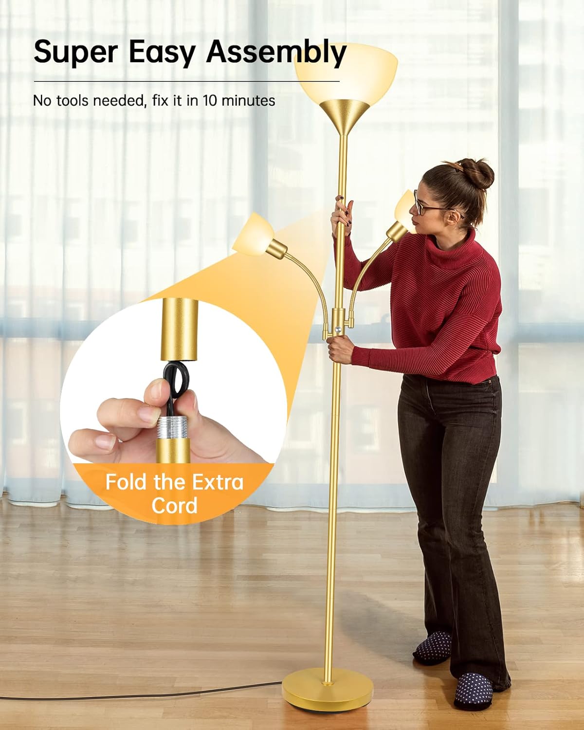🎀【Modern Floor Lamp with 3 Lights】With the stylish gold finish design, BoostArea 9W torch floor lamp comes with two 4W reading lamps, the gooseneck allows you to adjust angles to illuminate your projects, like reading, working or daily use; Emitting 2700K warm white light, the Eye-caring Mother-Daughter floor lamp will not harm your eyes; Also, with the 3-way rotary switch, you can directionally adjustable seperate lights or both ON/OFF according to different needs