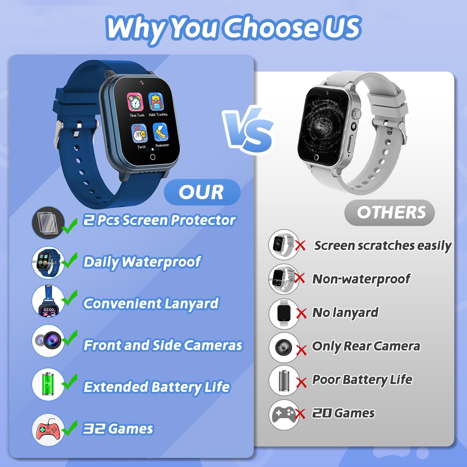 【All in One Smart Watch for Kids】Kids smart watch with dual camera, 32 puzzle games, MP3 player, voice recorder, habit tracking, games, pedometer, flashlight, alarm, stopwatch, calculator, theme, screensaver select, parental control, silent profile, time format, volume, etc. Comes with 2 extra protective films and lanyards, Which can bring convenience, fun and unprecedented new experience to children’s lives.