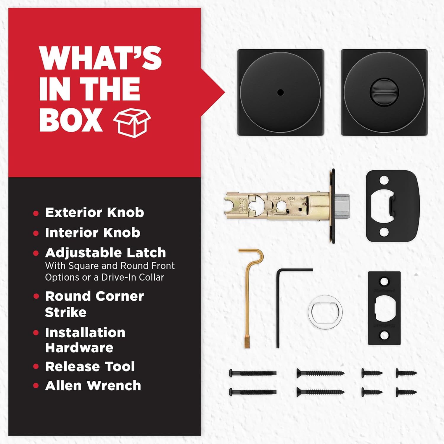 BOX INCLUDES: Exterior and Interior Knobs, Screws, Adjustable Latch, Strike Plate, Emergency Unlock Tool, Installation Hardware, Install Guide