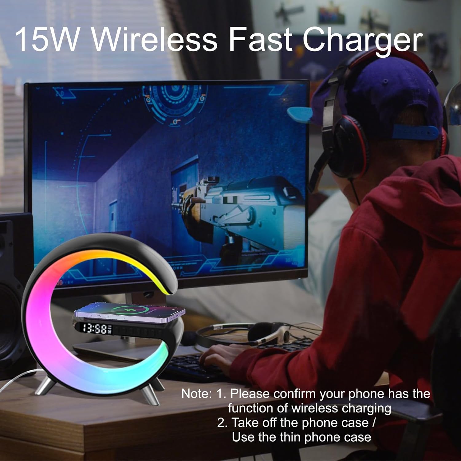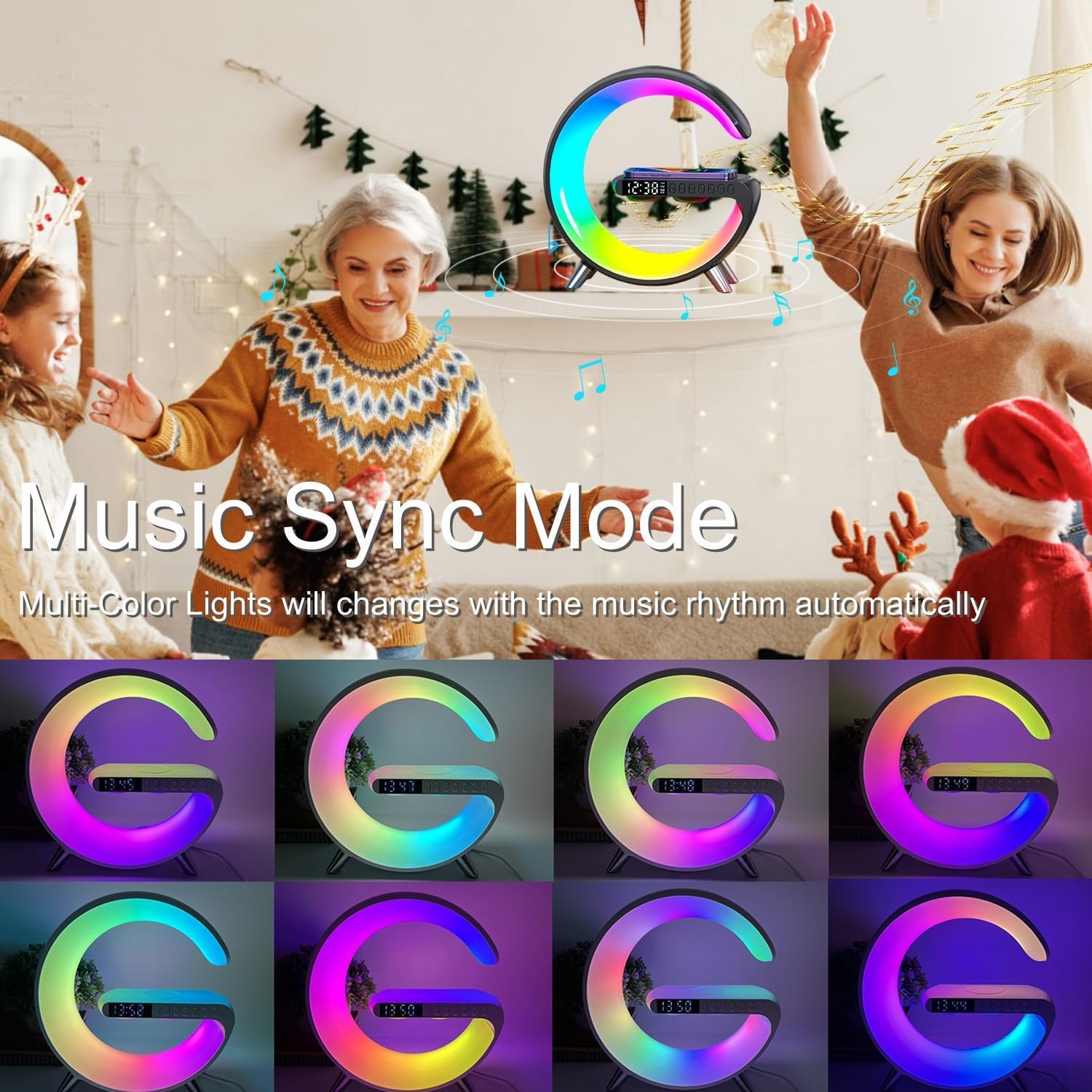 【Large G Multi-functional Atmosphere Lamp】This LED light’s G-shaped design is modern, simple, and stylish. It combines ambient lighting, Bluetooth speaker, wireless charging, alarm clock, white noise, free lifetime APP control, sunrise wake-up light, and more in one product. It’s not just practical but perfect for occasions like Valentine’s Day, birthdays, Christmas, New Year’s Day, Thanksgiving, and other holidays.