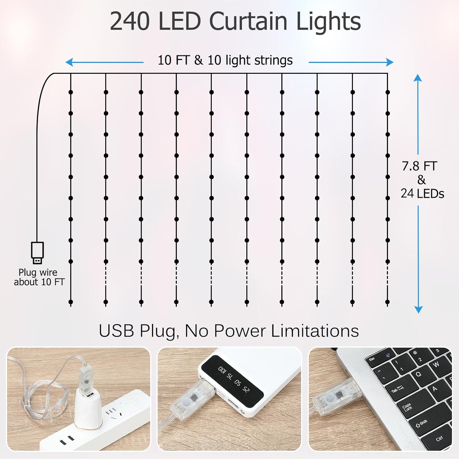 LED Curtain Lights: With 240 LED lights covering 10ft * 7.8ft, KepStars beautiful fairy curtain lights are perfect for creating an enchanting backdrop for bedroom, kitchen, stair, dining room, living room area, not just for indoor use, they’re also ideal for creating an outdoor wonderland.