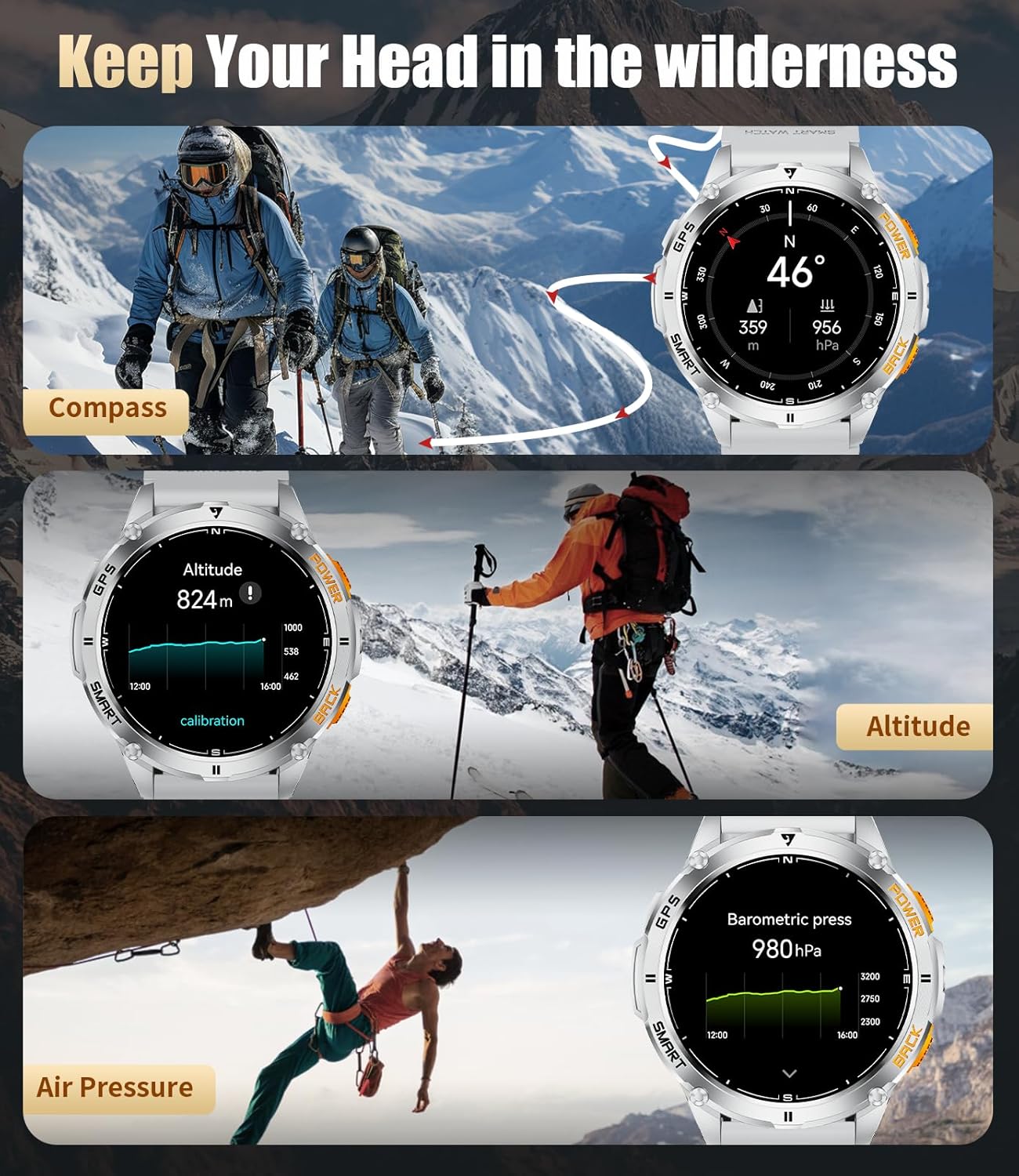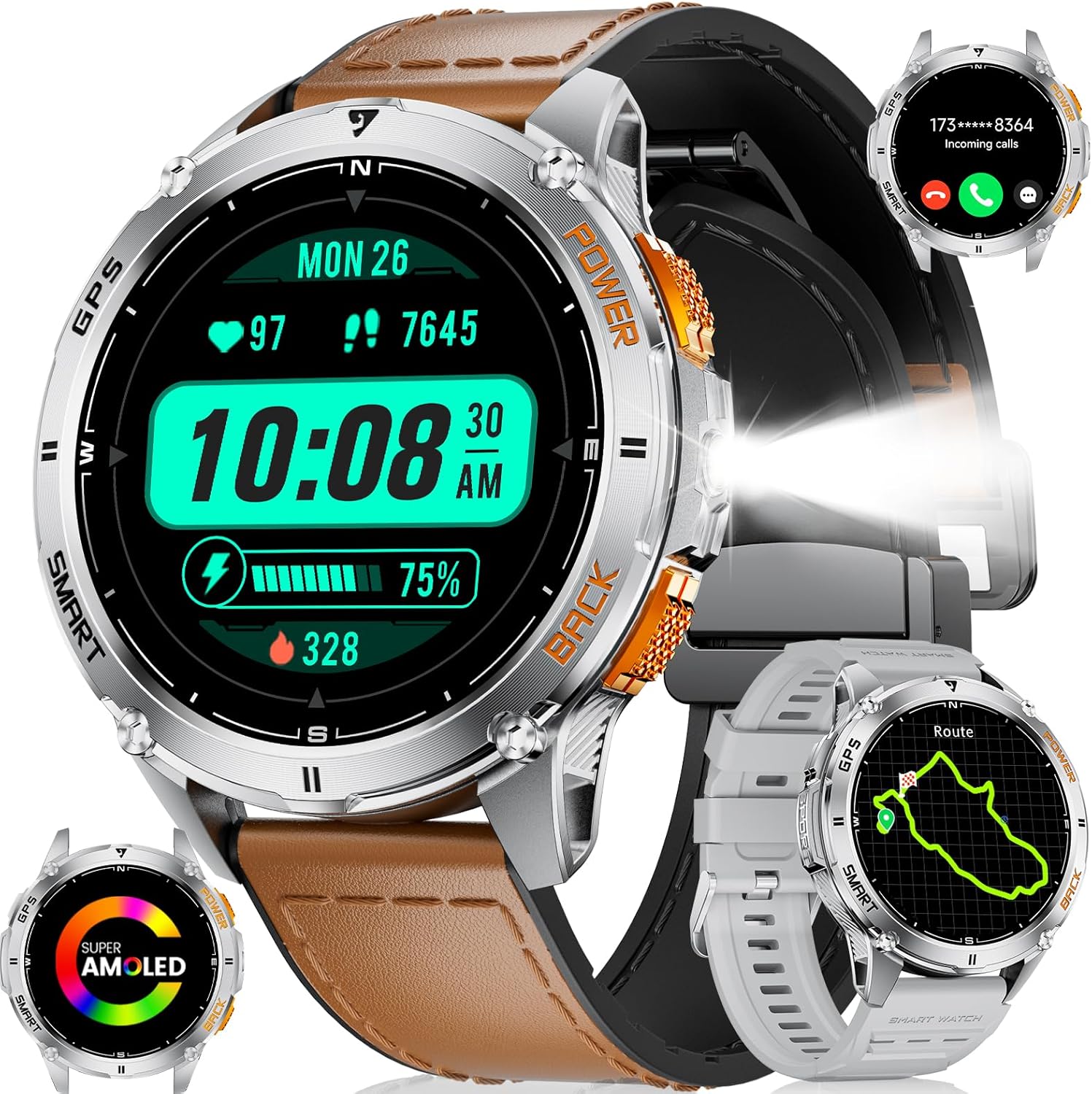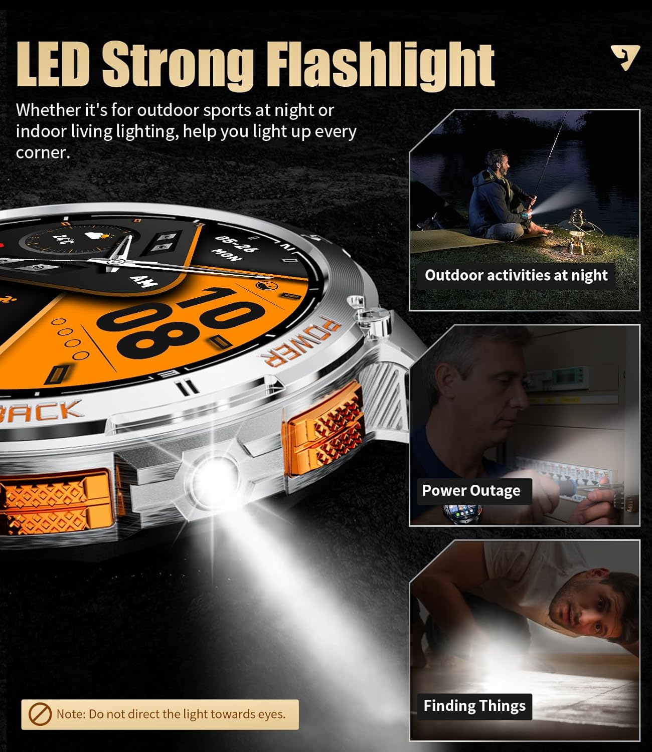🛰️【Compass & GPS & LED Flashlight】 This smart watch men supports a compass and GPS, as well as satellite systems including GLONASS, Beidou, Galileo, NAVIC, and QZSS, allowing you to accurately track your route during outdoor activities and providing comprehensive support for your adventures. For outdoor enthusiasts, this feature enhances safety and adds more enjoyment to outdoor activities. And the mens smart watch is equipped with a powerful flashlight function suitable for various situations. Whether you’re camping at night, looking for something, or handling an emergency, the flashlight provides ample illumination. (*Note: GPS route tracking should be activated in open areas.)