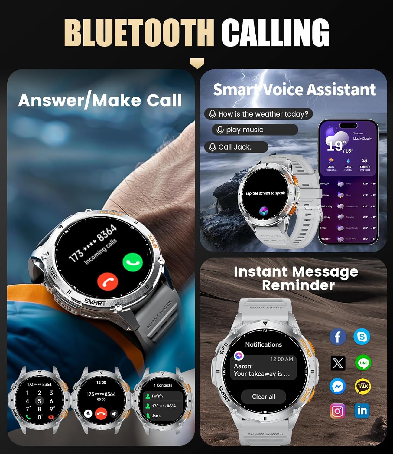 👨🏻💼【Compatible and Customer Service】 This outdoor smart watch is compatible with iOS 11.0 and above (calls require ios13 and above), Android 5.0 and above, BT4.0, covering the vast majority of smartphones on market. LIGE smart watch for iOS come with 24 month warranty and 24 h online support. After you receive the smart watch for android, if you have any problems, such as accessories, quality issues, operation questions or charging problems, please contact us and we will provide a solution within 24 hours.