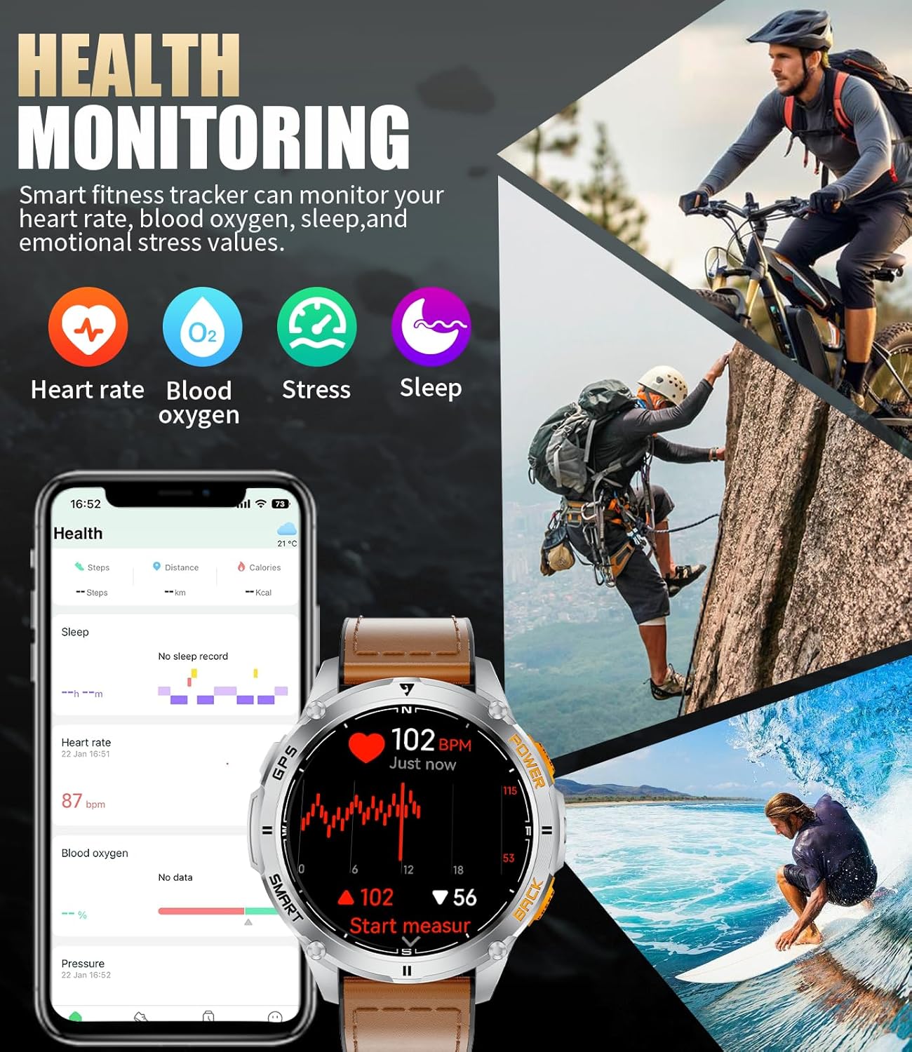 🏃【100+ Sport Modes】 This mens sport watches features 100 + sport modes, including running, cycling, hiking, swimming, and yoga, providing data tracking for each activity. The built-in GPS tracks your route, speed, distance, and calorie burn in real time. Each sport mode comes with its own set of specific parameters to ensure accurate monitoring of your performance across different activities. Whether you’re a fitness enthusiast or an outdoor adventurer, this watch will be your most reliable workout companion. (Note: GPS function only works during outdoor activities.)