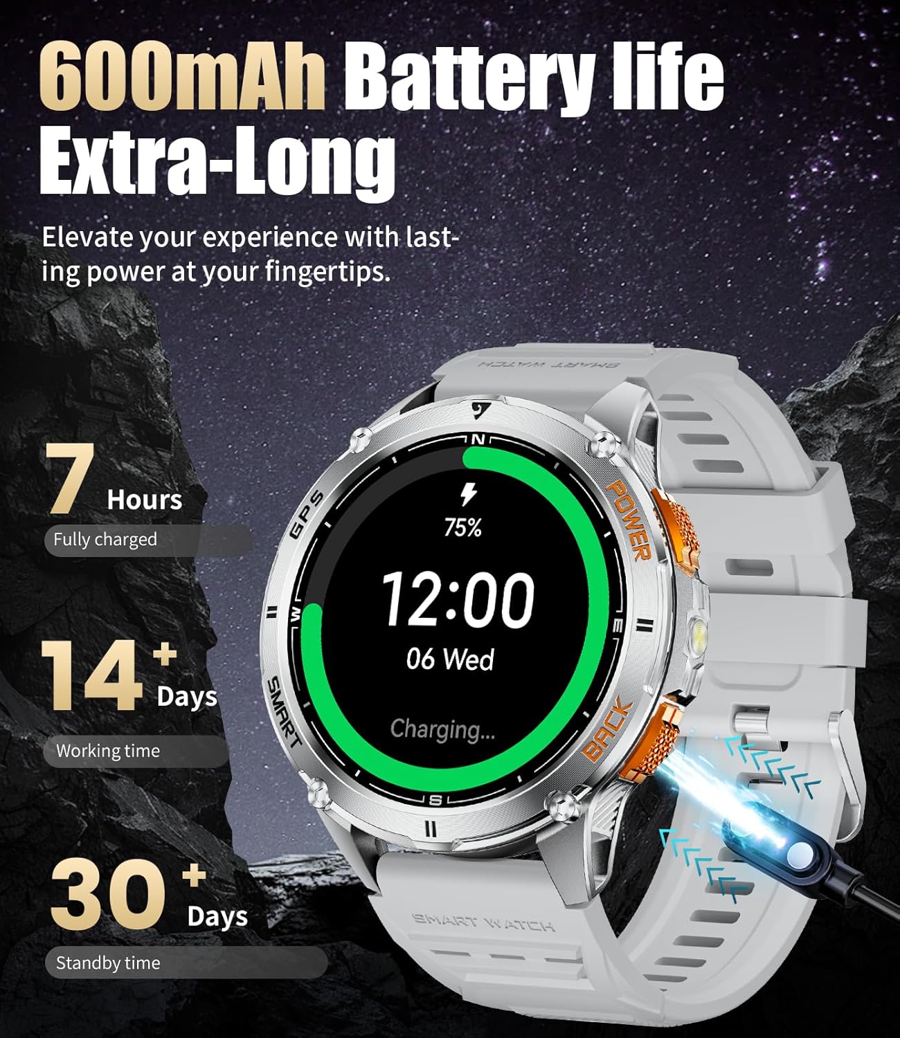 🔋【600mAh Long Battery Life】 This smart watch for iphone compatible not only features built-in GPS and a flashlight, but also offers impressive battery life. Whether you’re on long outdoor adventure or doing daily workouts, the fitness watches for men provides all-day power support. Equipped with 600mAh high-capacity battery and the latest AI-powered power-saving technology, it offers up to 7 days of usage and up to 30 days of standby time under normal use. Even when using high-power features like GPS navigation or the flashlight, the watch still provides a lasting and reliable experience.
