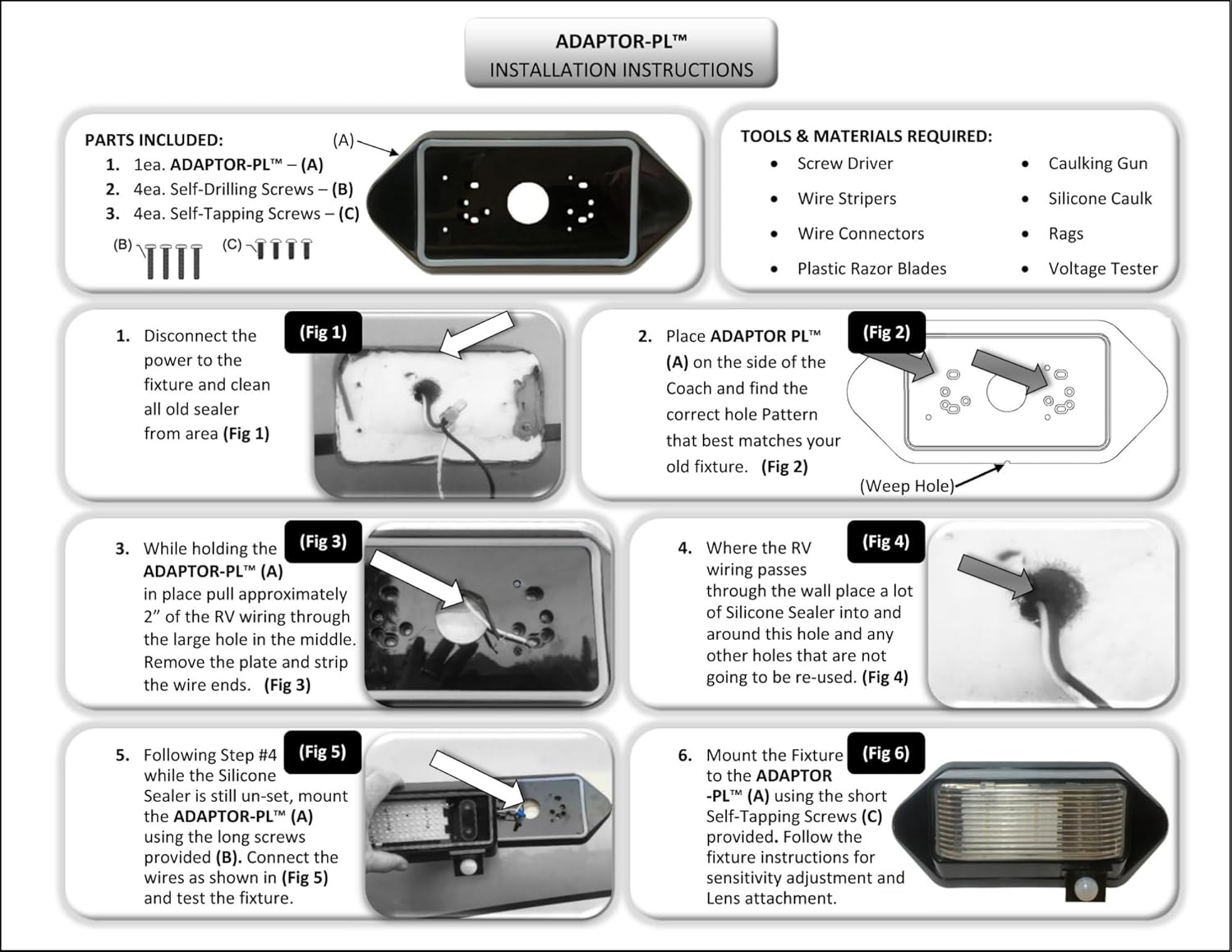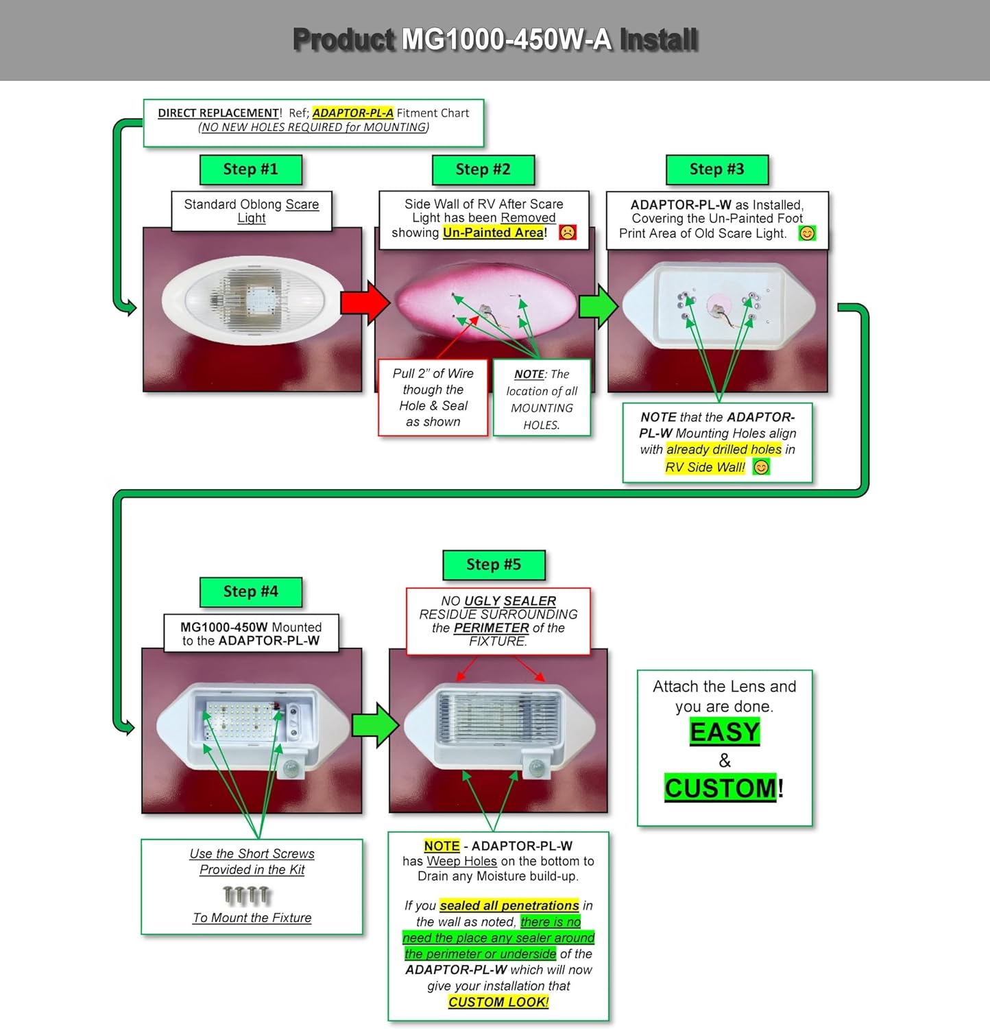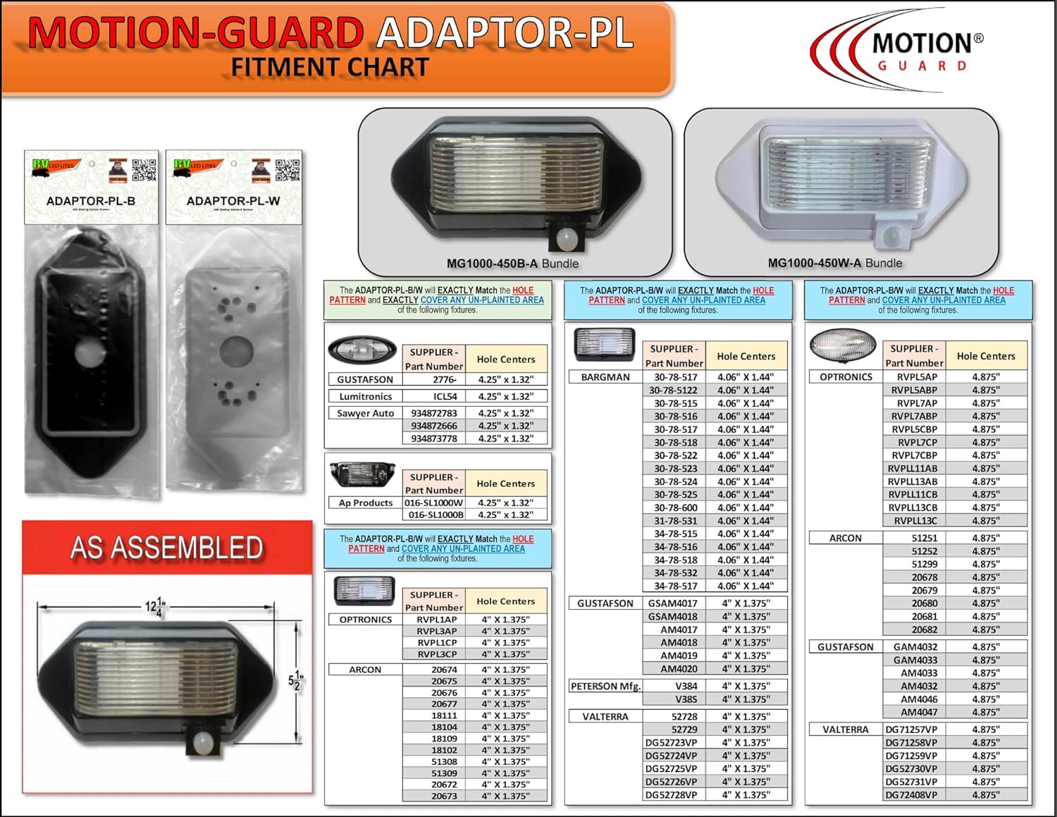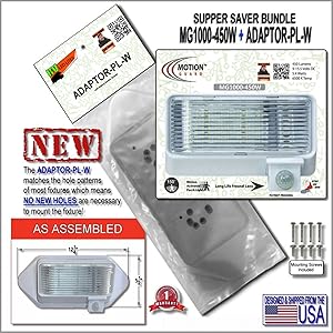 MG1000-450W-A Features: No New Holes Required if your fixture is listed on the MOTION-GUARD ADAPTOR-PL FITMENT CHART below. Will also cover any Un-Painted Areas once the old fixture has been removed. No messy BACK SEALING necessary to RV Wall if Installation Instructions are followed. Includes all the Mounting Screws necessary to install your new fixture. 450 lumens Two modes of operation; – Porch Light Mode or Motion Activated Light Security Mode Has a Light sensor to prevent activation in daylight and the PIR SENSOR has Adjustable Sensitivity Weatherproof, ip65