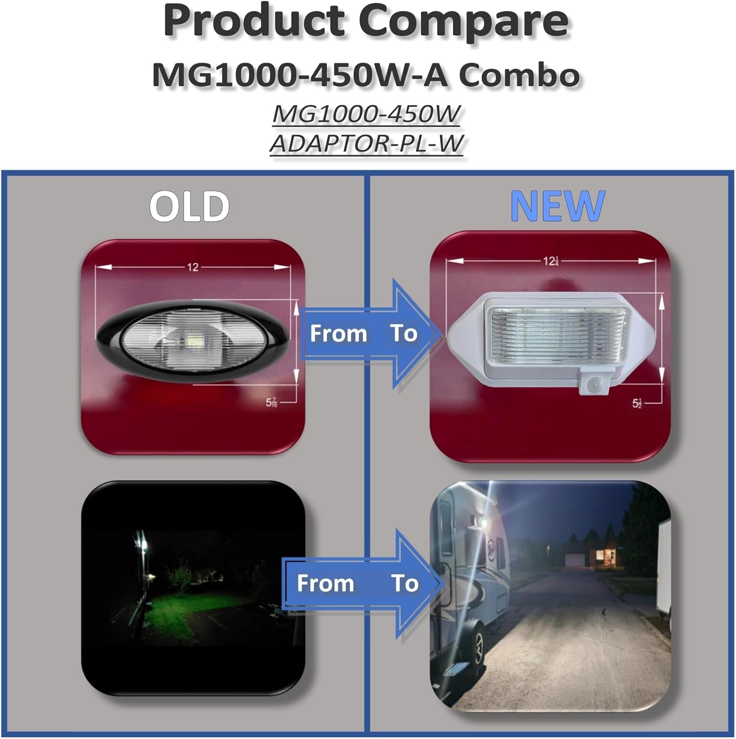 The MG1000-450W-A BUNDLE, designed by and American RVer and OEM Designer, “GREGG WILSON” here in the USA not China, will allow our Customers who Wish to UP-DATE to our MG1000-450W (MOTION-LIGHT) that is a NEWER, BRIGHTER SAFETY LED LIGHTING SOLUTION for their SAFETY and PERSONAL Protection.