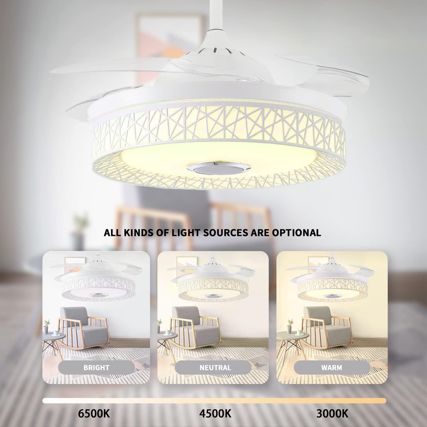 MoreChange 42” Retractable Ceiling Fan with Lights and Remote Control, Invisible Modern Bluetooth Chandelier Fan Lighting with Speaker Play Music 7 Colorful Dimmable Fixture for Bedroom/Living Room