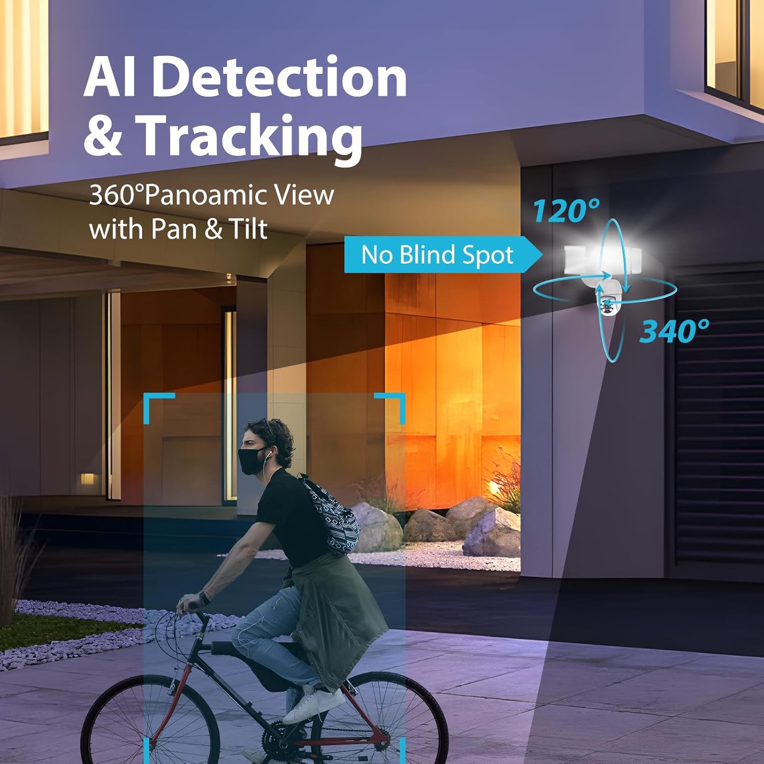 360° Panoramic View and Auto Tracking: floodlight security camera offers a 340° horizontal and 120° vertical rotation range, capturing every angle. The floodlight cam automatically locks onto and tracks any moving objects,ensuring nothing escapes its view