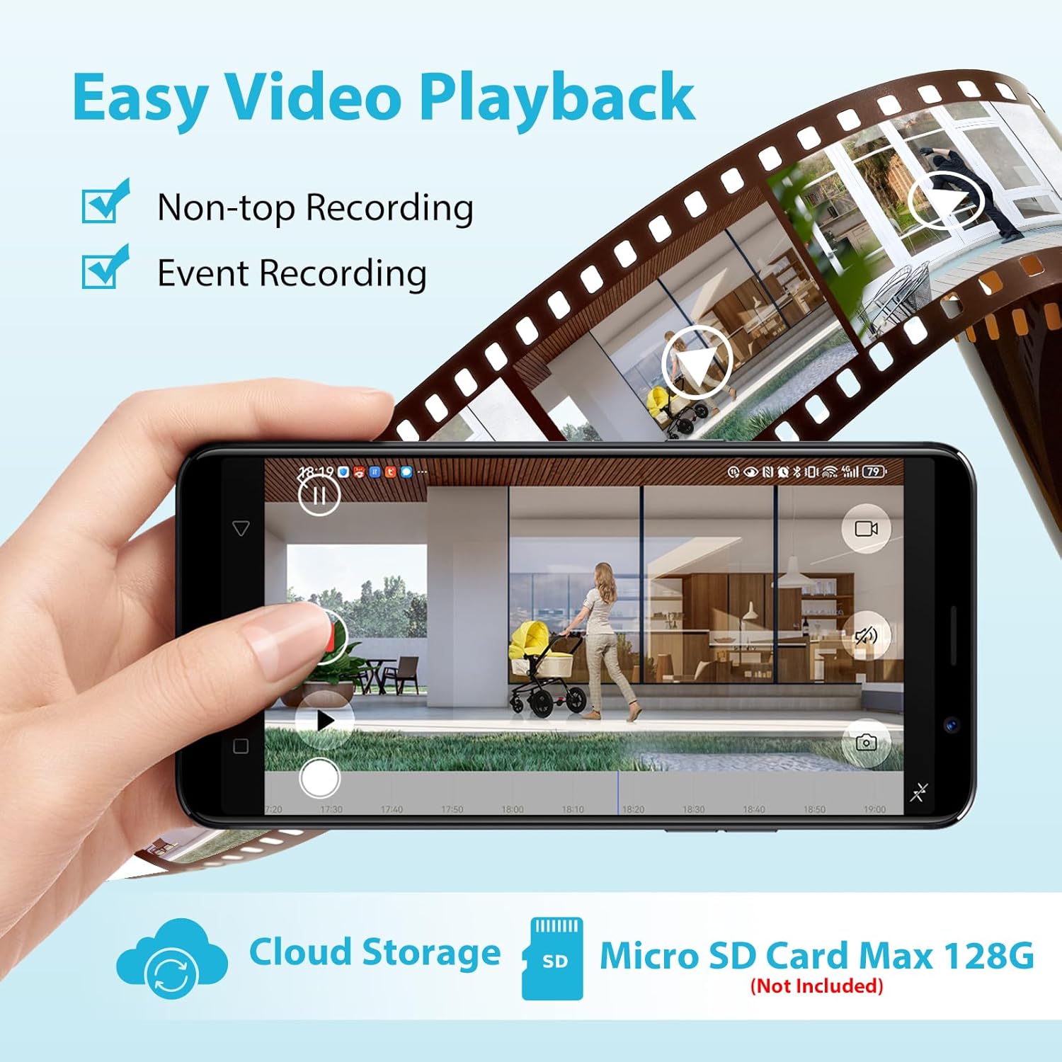Two-Way Talk & Versatile Storage Solutions: 2 way audio with visitors or dissuade intruders from afar using the camera’s audio system. The cloud storage or an SD card(up to 128GB) storage is up to you. Surveillance footage can be viewed at any time