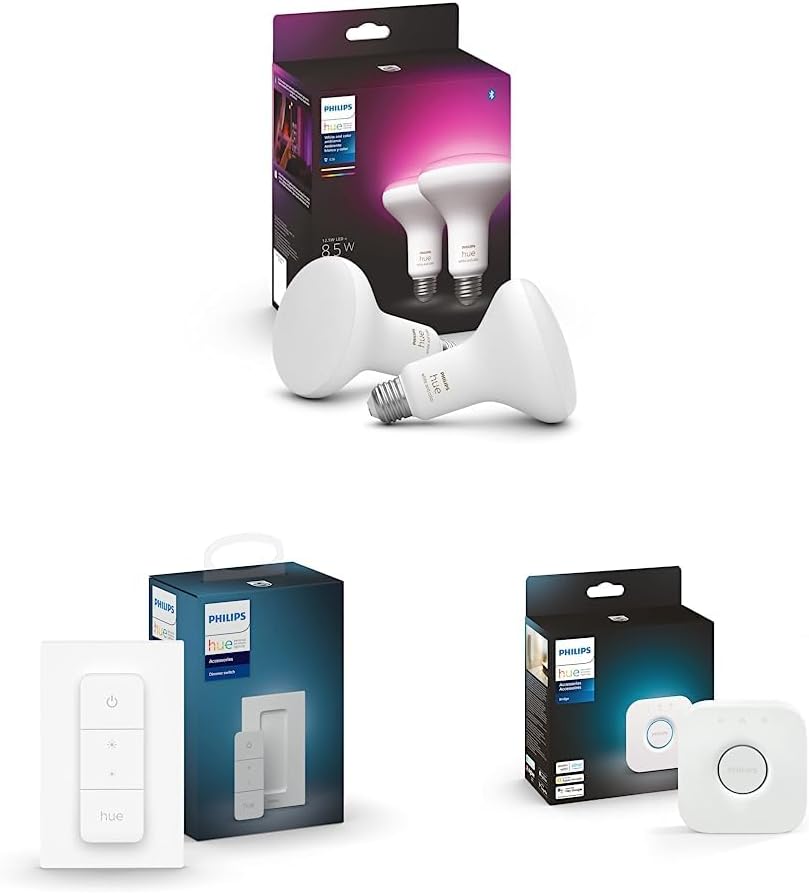Philips Hue White & Color Ambiance BR30 LED Smart Bulbs, 2 Bulbs (578096) & Smart Dimmer Switch, 1-Pack & Bridge, Unlocks Full Suite of Features