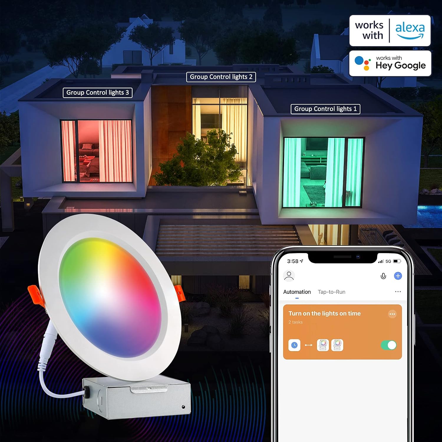🏆【Voice Control and Sync to Music】 Compatible with Alexa ,Google Assistant and Siri Use simple dialogue to control the smart recessed lighting and release your hands. You can control the moment of light by sound.The led recessed lighting can change the color with the beat of the music or the sound of the game