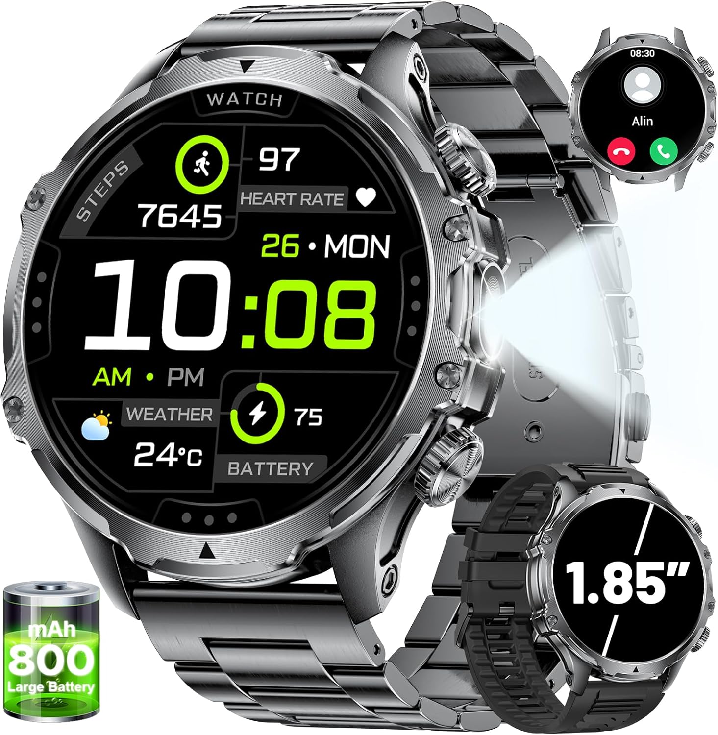 Smart Watches for Men(Answer/Make Calls) with LED Flashlight, 1.85″HD Screen Outdoor Sports Smartwatch ,800mAh Battery,Heart Rate/SpO2/Sleep Monitor 5ATM Waterproof Fitness Tracker for Android iOS