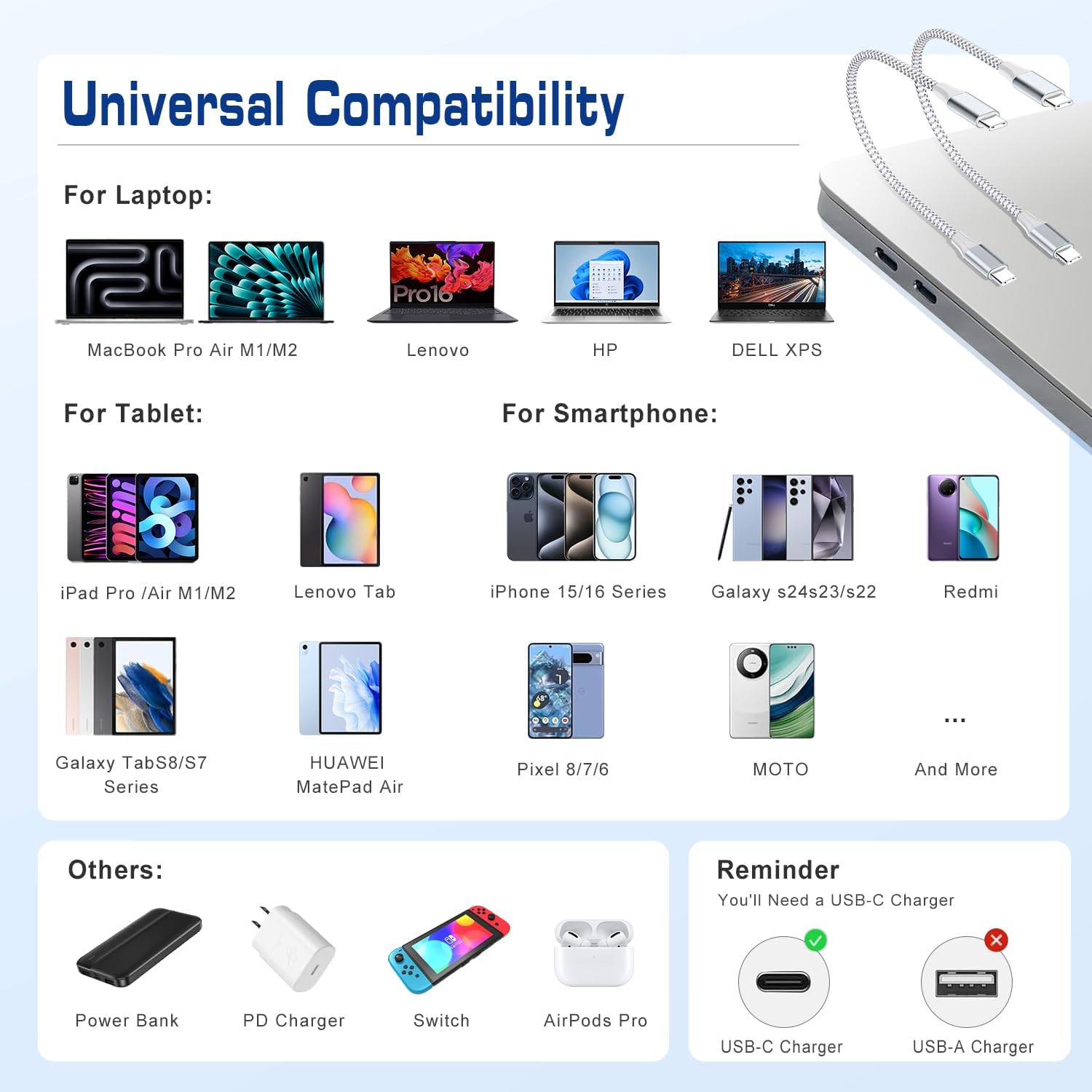 Universal Compatibility:The braided usb c to usb c seamlessly compatible for a wide array of Type C devices, including the latest iPhones (16/16 Plus/16 Pro/16 Pro Max, 15/15 Plus/15 Pro/15 Pro Max), MacBook Air/Pro, i-Pad Mini 6, i-Pad Pro, i-Pad Air, Samsung Galaxy flagships (S23 Ultra/S23+/S23/S22 series, Note 20), and more USB-C equipped devices.