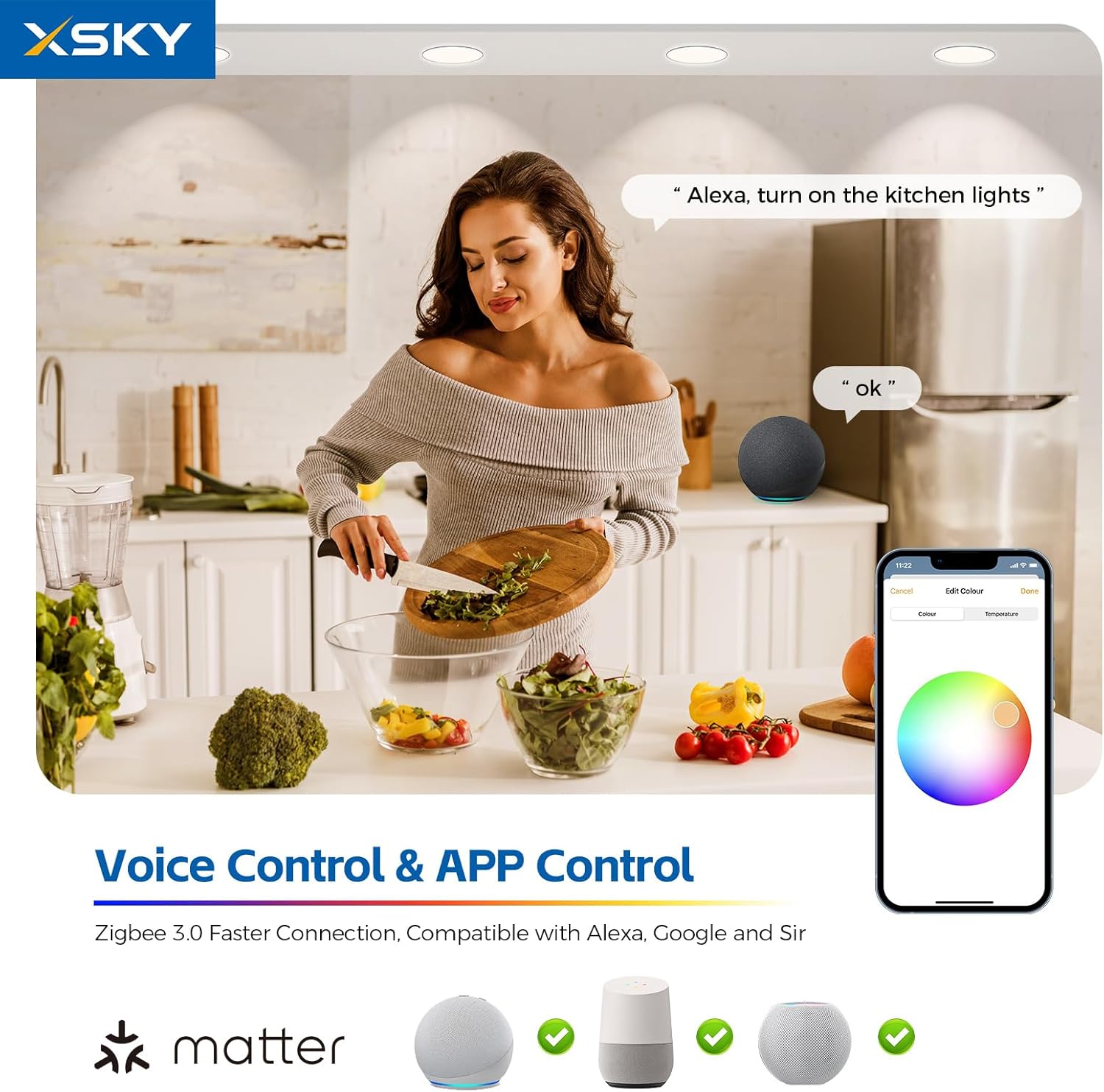 Xsky Smart Recessed Lighting 6 inch 4 Pack, Matter Bridge Include, Matter Light, Zigbee 3.0 RGBCW Color Changing, 13W 1100LM Smart Downlight, Compatible with Alexa/Google Assistant/Siri